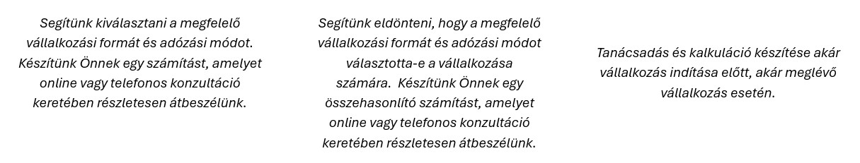 Amennyiben vállalkozás indítása előtt áll, de nem tudja, hogy milyen vállalkozási és adózási formát válasszon vagy a már meglévő vállalkozása esetén nem biztos abban, hogy a jelenlegi adózási mód a megfelelő, akkor válasszon az alábbi szolgáltatásaink közül, hogy segíthessünk.